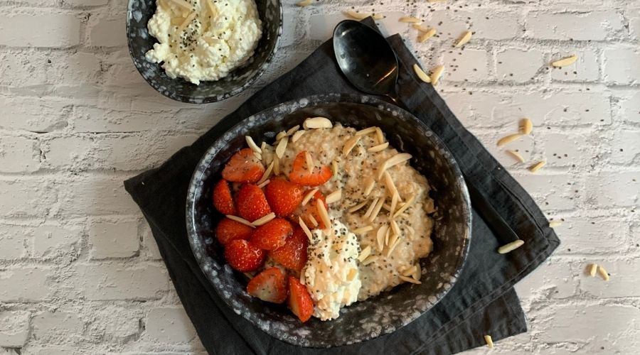 In deze variant zorgen we voor een eiwitboost door het gebruik van eiwitpoeder (met vanillesmaak!), melk, frisse hüttenkäse, amandelen en chiazaadjes. Uiteraard wordt deze havermout gemaakt zonder toegevoegd suiker, maar met heerlijke aardbeien