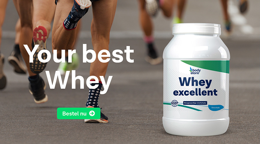 Hardlopers hebben genoeg aan 2 gram eiwit per kilo lichaamsgewicht per dag. Weeg je bijvoorbeeld 70 kg, zorg dan dat je elke dag 140 gram proteïne eet. Dit haal je uit gewone voeding (eieren, vlees, vis, kwark, kip, etc) en eiwitshakes. Als eiwitshake adviseren we Whey Excellent omdat het echt snel door het lichaam wordt opgenomen. Daarnaast is Whey Excellent heerlijk vol van smaak en heeft een zeer hoge klantenwaardering uit meer dan 1100 reviews.