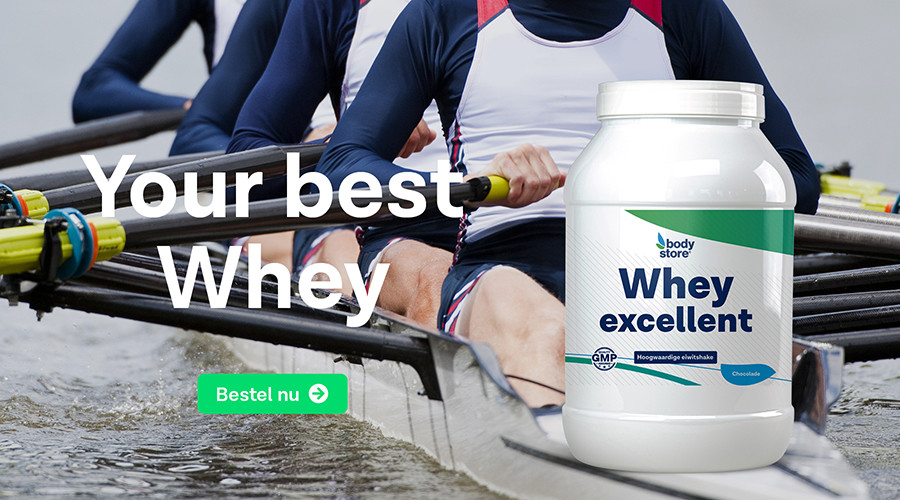 Volgens onderzoek gebruiken Olympische roeiers 2-2,5 gram eiwit per kilo lichaamsgewicht per dag. Amateur roeiers hebben genoeg aan 2 gram eiwit per kilo lichaamsgewicht per dag. Weeg je bijvoorbeeld 70 kg, zorg dan dat je elke dag 140 gram eiwitten binnenkrijgt. Dit haal je uit gewone voeding (eieren, vlees, vis, kwark, kip, etc) en eiwitshakes. Als eiwitshake adviseren we Whey Excellent omdat het zeer snel door het lichaam wordt opgenomen. Bovendien is Whey Excellent heerlijk vol van smaak en heeft een zeer hoge klantenwaardering uit meer dan 1100 reviews.