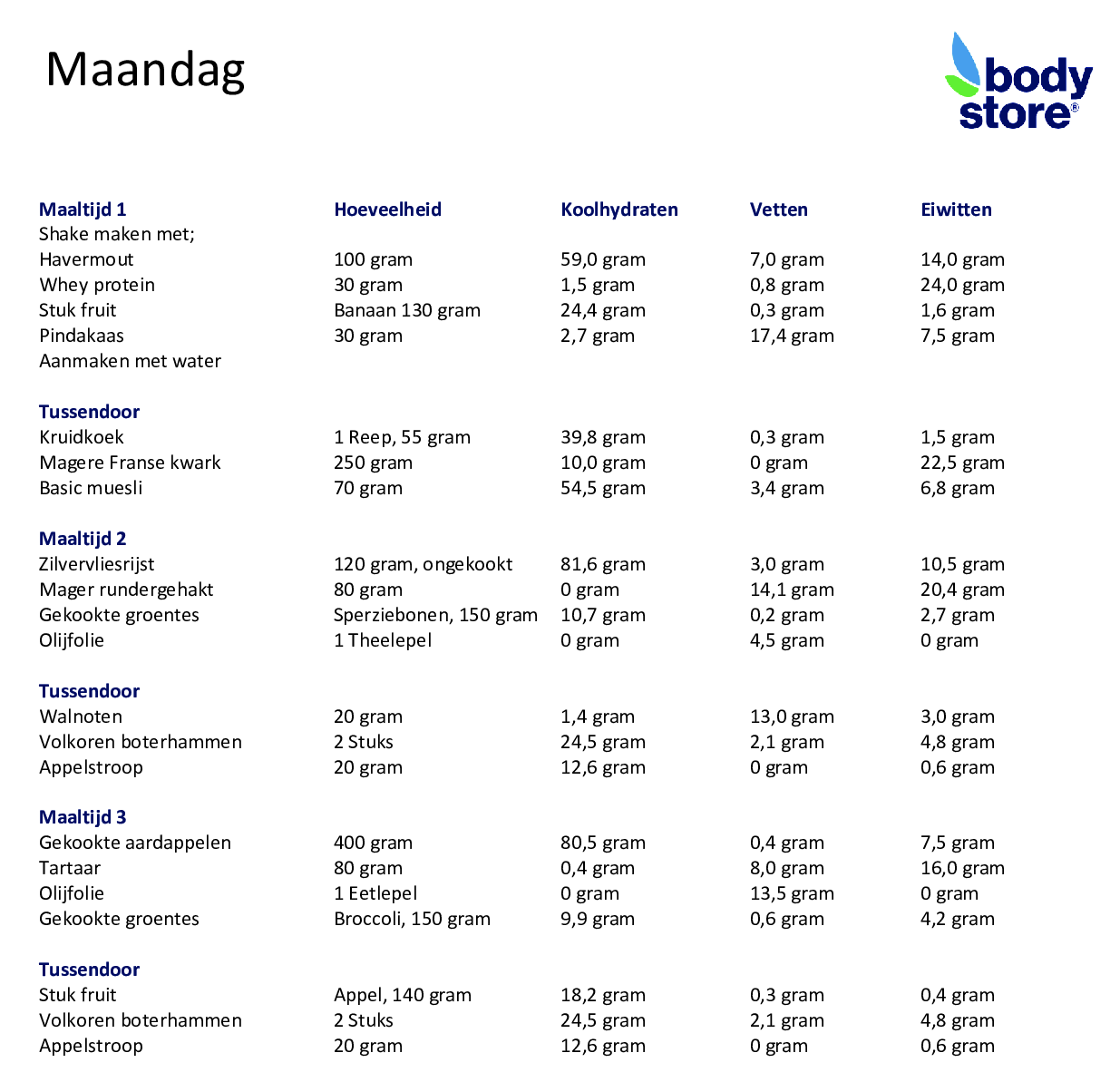 Wil je graag bulken? Heb je al een plan of pas je grofweg wat tips toe en hoop je dan snel aan te komen? Wil je liever niks aan het toeval overlaten dan is een op maat gemaakt voedingsschema wel wat voor jou! 8 weken lang elke dag precies weten wat je per moment moet eten om aan de gewenste aantal kilo's te komen is perfect! Hieronder zie je 1 voorbeelddag van een voedingsschema op basis van de macronutriënten. Samen gaan wij werken aan jouw droom lichaam! We wensen je heel veel succes en zet hem op!