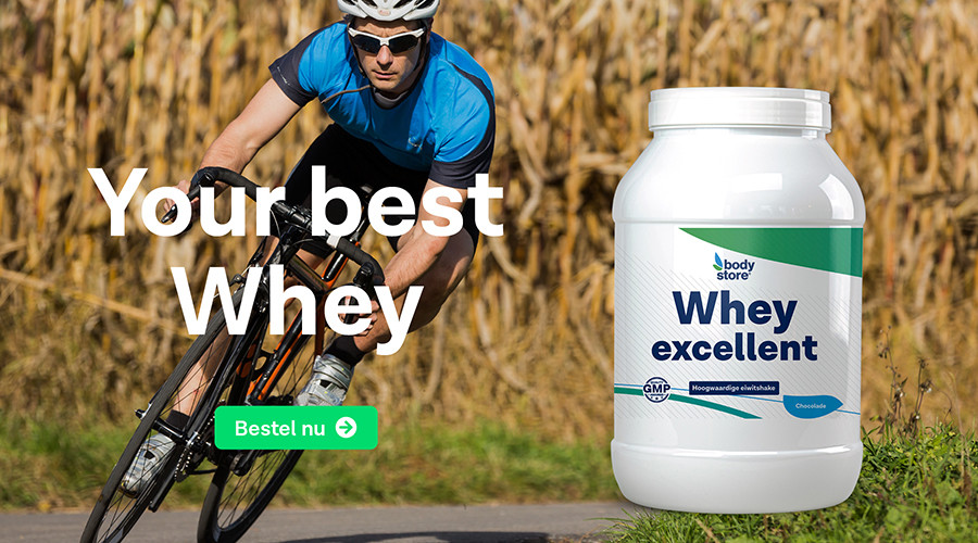 Amateur wielrenners hebben voldoende aan 2 gram eiwit per kilo lichaamsgewicht per dag. Weeg je bijvoorbeeld 80 kg, zorg dan dat je elke dag 160 gram eiwitten binnenkrijgt. Dit haal je uit gewone voeding (eieren, tofu, zalm, kabeljauw, makreel, haring, kwark, etc) en eiwitshakes. Als eiwitshake adviseren we Whey Excellent. Whey Excellent wordt zeer snel door het lichaam opgenomen en is rijk aan BCAA aminozuren, welke bijdragen aan een versneld spierherstel. Bovendien is Whey Excellent lekker romig en vol van smaak, van Vanilla tot Choco, dus voor elk wat wils.