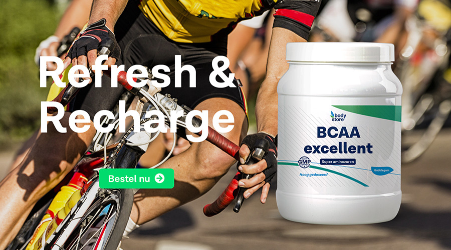Wielrenners leggen lange afstanden af en verliezen hierdoor veel vocht en mineralen. Daarom is het belangrijk om tijdens de training gehydrateerd te blijven. Drink zeker 1 liter water tijdens je training of wedstrijd. Een goed supplement om in je water te doen is BCAA poeder, dit kun je gedurende de training drinken. Deze essentiële aminozuren zijn bouwstenen voor spiercellen en kunnen ook worden omgezet tot energie in de vorm van glucose. BCAA's kunnen een belangrijke rol spelen in een sneller herstel van je spieren waardoor uiteindelijk een betere sportprestatie kan worden geleverd. Voor wielrenners adviseren wij BCAA Excellent. BCAA Excellent bevat 2 x zoveel als het gemiddelde BCAA supplement. Daarnaast bevat BCAA EXCELLENT de aminozuren L-Glutamine en L-Lysine om de werkzaamheid te verhogen.